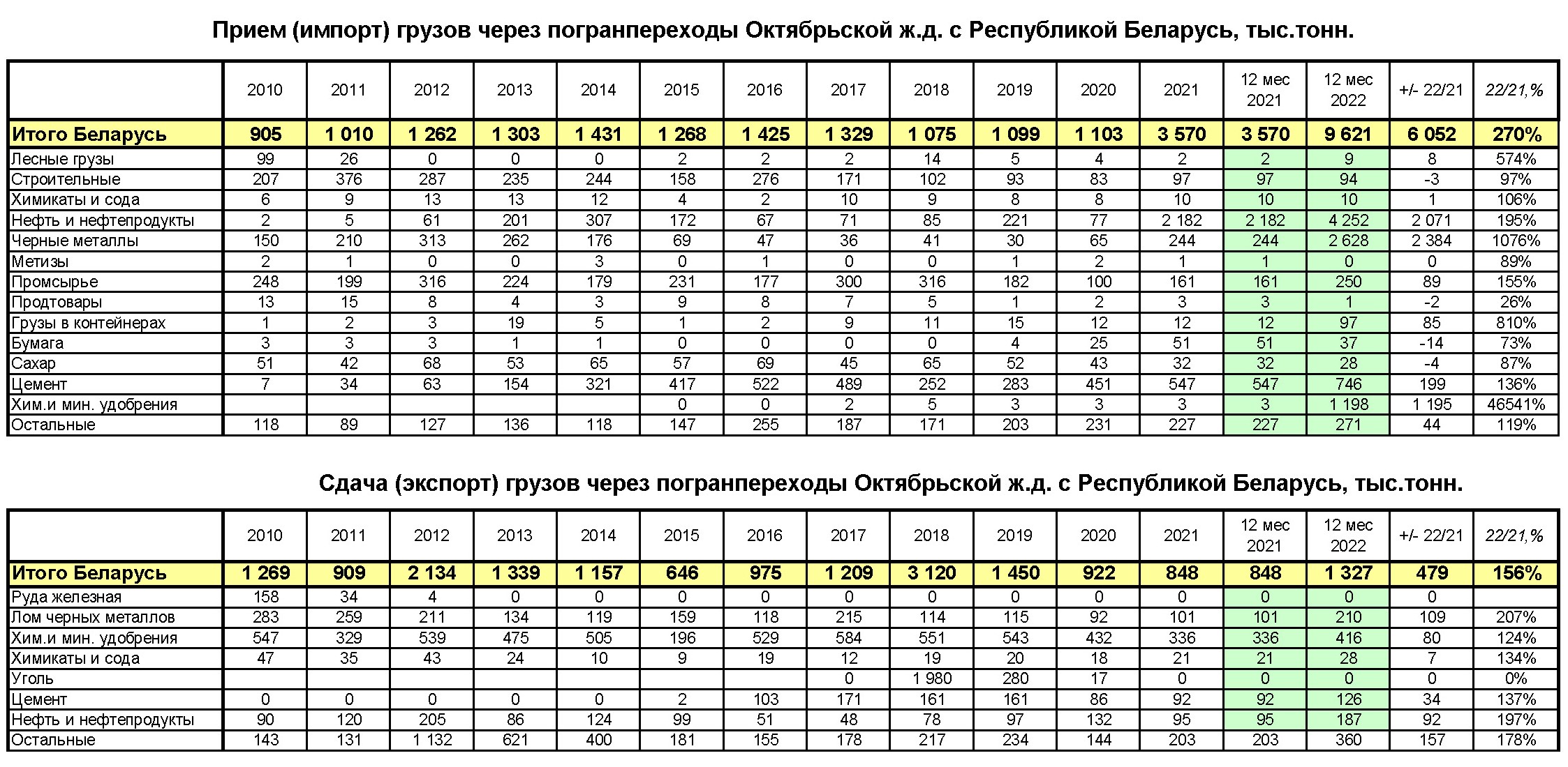 Импорт (ввоз) составил 1,3 млн. тонн, что на 56%, или на 479 тыс.тонн выше 2021 года. Основные импортные грузы: химические и минеральные удобрения – доля в импорте 31% (415,9 тыс.т.), лом черных металлов – 16% (210,2 тыс.т.), нефть и нефтепродукты –14% (187,1 тыс.т.), строительные грузы – 11% (139,4 тыс.т.), цемент – 10% (126,3 тыс.т.), лесные грузы – 9% (117,7 тыс.т.).